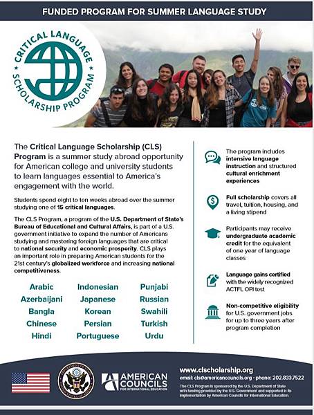 Applications are now being accepted for the U.S. Department of State’s Critical Language Scholarship (CLS) Program at http://www.clscholarship.org/